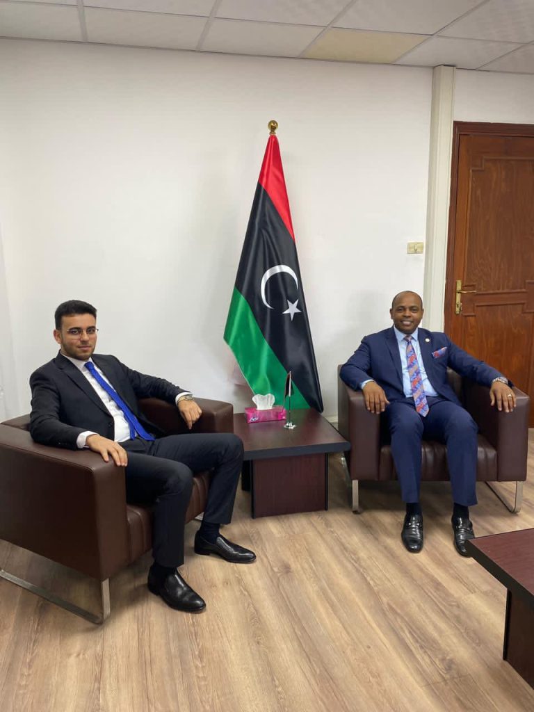 عقد صباح اليوم الاثنين الموافق 11/1/2021 بمقر ديوان وزارة الخارجية والتعاون الدولي اجتماعا بين مدير عام الشركة الليبيه للخدمات الارضية السيد: فتحي الدلعوب ؛ووكيل وزارة الخارجية للتعاون الدولي وشؤون المنظمات السيد: عمر الكتي.